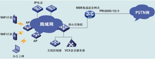 企業(yè)內(nèi)部部署WLAN和語(yǔ)音系統(tǒng)。企業(yè)員工使用WLAN/GSM雙模手機(jī)可在WLAN覆蓋區(qū)優(yōu)先通過(guò)WiFi網(wǎng)絡(luò)實(shí)現(xiàn)內(nèi)部通話(huà),參加電話(huà)會(huì)議,也可撥打PSTN外線(xiàn)電話(huà),代替座機(jī)和手機(jī)的功能。