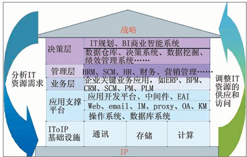 按照華為3Com的構(gòu)想,如果把整個(gè)IT系統(tǒng)比做一座房屋,那么整個(gè)房屋的地基就是IP網(wǎng)絡(luò),需要基于IP網(wǎng)絡(luò)來構(gòu)建通信、存儲(chǔ)、計(jì)算等IT基礎(chǔ)設(shè)施。在這些基礎(chǔ)設(shè)施之上,則是應(yīng)用支撐平臺(tái)(操作系統(tǒng)、數(shù)據(jù)庫(kù)系統(tǒng)、應(yīng)用開發(fā)平臺(tái)等),基于應(yīng)用支撐平臺(tái)提供給機(jī)構(gòu)的關(guān)鍵業(yè)務(wù)流程信息系統(tǒng)(如ERP、SCM等),最終為用戶的管理和決策提供支持。“在戰(zhàn)略與IT基礎(chǔ)設(shè)施之間實(shí)現(xiàn)實(shí)時(shí)同步互動(dòng),IT為用戶高層提供商業(yè)智能系統(tǒng)、決策系統(tǒng),以便決策層即時(shí)掌握信息,作為機(jī)構(gòu)戰(zhàn)略決策、戰(zhàn)略挑戰(zhàn)的依據(jù);用戶可以依據(jù)內(nèi)、外部變化,進(jìn)行戰(zhàn)略調(diào)整時(shí)快速分析新的IT資源需求,同步調(diào)整IT資源的配置,從而使IT與業(yè)務(wù)戰(zhàn)略保持同步。”這正是IToIP的基本理念。