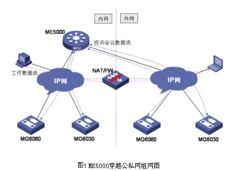 ME5000 提供4個以太網口,其中3個網口可以用來召開視訊會議,這3個網口可以跨越在不同的網段上,實現公、私網的穿越,同時也可以為用戶提供網絡負載均衡的功能。在存在防火墻的環(huán)境中,可以把ME5000的兩個網口分別布置在防火墻的兩側,連接內、外網的視訊終端,從而可以直接繞過防火墻進行開會,而不影響其它數據業(yè)務的安全,內、外網進出數據業(yè)務時仍然會通過防火墻,網絡安全保護作用不受影響。
