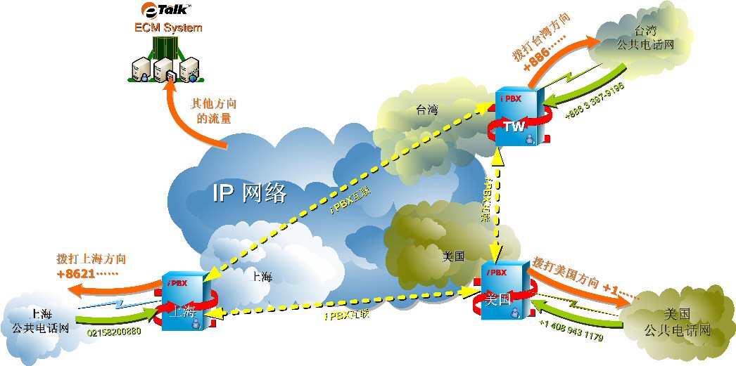 eTalk® iPBX可同時或者分別接受來自一個或者多個傳統(tǒng)電信運營商和虛擬運營商提供的語音服務(wù)。甚至可以在多臺i PBX之間實現(xiàn)零成本互通,合理利用各地PSTN資源,以降低企業(yè)通訊成本。