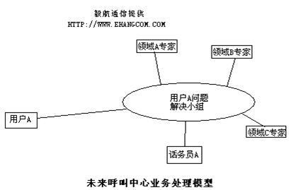 未來的呼叫中心里服務每個用戶的不是單個話務員,而是一個隨需組建的專家組。話務員根據(jù)用戶的問題,在適當?shù)臅r候邀請相應專家參加到用戶問題解決小組,話務員負責小組內的信息協(xié)調和流程控制。比如用戶投訴沒有收到訂貨,話務員可以加入該用戶的跟蹤業(yè)務員,當從業(yè)務員處了解到該用戶有欠款記錄,那么話務員可以把財務人員加入到臨時問題解決小組,財務人員可以準確的告訴用戶是那筆款有問題,需要處理,這樣可以當場讓用戶明白問題的根源,并還能得到財務人員的處理建議和后續(xù)操作流程指導,做到溝通高效,有效,而且真正能減少抱怨,提高業(yè)務效率。