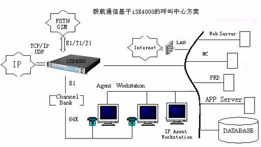 相對于現(xiàn)在的兩種主流呼叫中心方案,毅航通信基于iSX4000呼叫中心解決方案直接整合了Internet的接入。傳統(tǒng)由IVR完成的操作也可以通過Web頁面上的流程實現(xiàn),這樣用戶通過下拉菜單、簡單填寫、點擊按鈕等操作完成客戶識別、業(yè)務識別等操作,這些流程完成后,通過VoIP對呼叫中心呼入,由呼叫中心對呼入進行受理,再按照相應的原則分配到座席,座席再作相應的應答和處理,從而為客戶提供了一個通過Web站點直接進入呼叫中心的途徑,把Internet所具有的豐富信息資源和強大的功能賦予呼叫中心,它向客戶提供一個可訪問的Web站點,使得呼叫中心從“撥叫到交談(Dial to Talk)”發(fā)展到“點擊到交談(Click to Talk)”,通過Internet可以提供IP電話語音呼叫、Call Back、IP傳真、IM、E-mail等功能,擴展了通信渠道,一方面用戶可以實現(xiàn)免費接入到呼叫中心,另一方面企業(yè)能夠向更多的客戶提供優(yōu)質、方便的服務資源,而且由于這些資源的價格相對傳統(tǒng)通信便宜,使企業(yè)為客戶提供全國、乃至于全球服務成為可能,提高了企業(yè)客戶服務水平,增強了企業(yè)競爭力。毅航通信統(tǒng)一呼叫中心解決方案系統(tǒng)結構如圖所示: