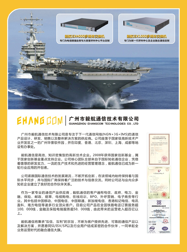 廣州市毅航通信技術有限公司是專注于下一代通信網(wǎng)絡(NGN+3G)的通信產(chǎn)品設計、研發(fā)、銷售以及整體解決方案的供應商。