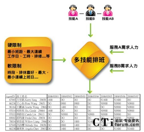 在實(shí)施人資優(yōu)化軟件之后,呼叫中心即可開始對各服務(wù)人力作"量"與"質(zhì)"的管理,確定資源做最佳運(yùn)用,如下圖所示: