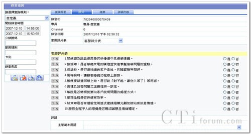呼叫中心質(zhì)量管理最重要的工作之一,就是評核各類型業(yè)務(wù)電話服務(wù)的質(zhì)量。為了要做到公平與公正,質(zhì)檢樣本的篩選不只要相同業(yè)務(wù)服務(wù)內(nèi)容,更要相同的 環(huán)境條件,例如:不同業(yè)務(wù)類別(成交電話篩選、抱怨電話篩選)、日期(尖峰日電話篩選、離峰日電話篩選)提供公平的選擇基礎(chǔ)作為評核的樣本,不因隨機取樣造成對客服人員整體績效評估失之偏頗。即便呼叫中心因應(yīng)企業(yè)策略產(chǎn)生新的業(yè)務(wù)服務(wù)時,QMS8100KS可充分整合前端應(yīng)用系統(tǒng)的改變,可依據(jù)所需的篩選條件組合或與CTI整合后的篩選字段,完成交叉錄音檔案篩選。
