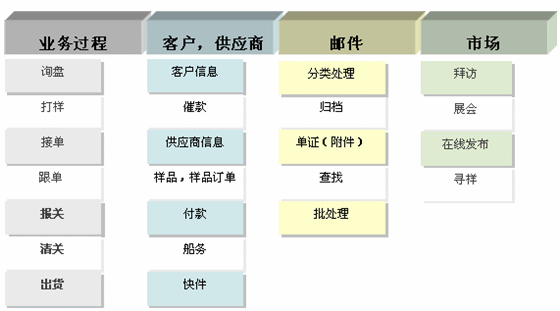 外貿(mào)企業(yè)主要通過Email的方式與客戶及潛在客戶進行業(yè)務(wù)聯(lián)系。由于一般Email系統(tǒng)的客戶端都是相對獨立的,業(yè)務(wù)郵件都分散在各業(yè)務(wù)員的Email系統(tǒng)中,客戶資源的統(tǒng)一管理、Email的監(jiān)督、審批、歸檔管理是使外貿(mào)企業(yè)頭疼的問題。