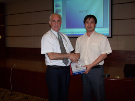 圖為北京站研討會(huì)一角及一等獎(jiǎng)(T33數(shù)碼相機(jī))中獎(jiǎng)?wù)吲cDana先生合影。