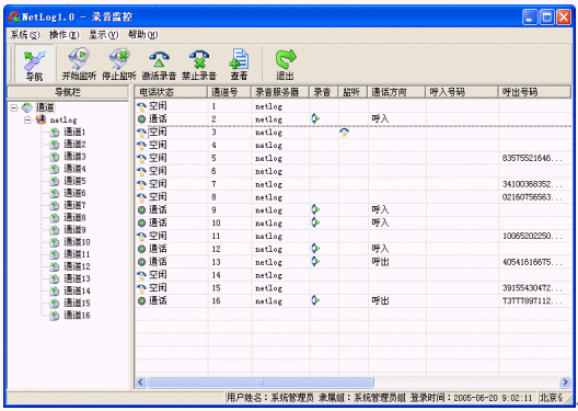 Netlog系統(tǒng)中控制臺是一個統(tǒng)一配置和管理的平臺,可以部署在網(wǎng)絡(luò)內(nèi)的任意一臺主機上,各個功能模塊都可以單獨工作,也可以同時使用,控制臺所有模塊可以通過系統(tǒng)導(dǎo)航(ToolBar)來引導(dǎo)啟動。用戶可以通過控制臺操作網(wǎng)絡(luò)上所有記錄服務(wù)、數(shù)據(jù)服務(wù)和文件服務(wù)?刂婆_作為最終用戶終端可以完成用戶的所有操作,設(shè)置每個服務(wù)器甚至每個通道的屬性、執(zhí)行各種用戶操作、指定服務(wù)的工作方式、錄音查詢、錄音管理、輸出報表、排班等?刂婆_根據(jù)用戶權(quán)限的不同限定用戶的操作,更好的保障了系統(tǒng)的運行和語音記錄文件的安全。