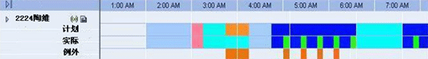 如圖,通過與PBX、CTI系統(tǒng)的接口,排班系統(tǒng)獲取座席的實(shí)時狀態(tài)信息,如登錄、接聽、話后處理、登出等,并以不同的顏色進(jìn)行表示,與計劃的班次安排進(jìn)行比對,從而監(jiān)控到座席的遵時例外(非遵時)。通過這種方式,座席的實(shí)時狀態(tài)變化能夠及時的得到監(jiān)控,便于管理人員精確的監(jiān)控遵時,同時,也把班長從遵時管理中部分解脫出來。