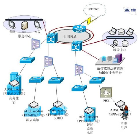 在以以太網技術為主建設的運營區(qū)域,在中心由一臺模塊化的核心交換機支持,輔以多臺BASE設備連接,在接入層用交換機做接入設備,保證用戶數據的快速傳播。在網絡核心處,部署信利公司的藍信寬帶認證計費系統,負責對全網用戶的安全認證、計費及管理。藍信寬帶認證計費系統除支持標準的RADIUS協議外,還支持PPPoE、802.1x認證。在用戶終端處,部署藍信特制的PPPoE客戶端,實現撥號上網。