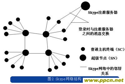 與常規(guī)的電信業(yè)務(wù)網(wǎng)絡(luò)不同的是,Skype的網(wǎng)絡(luò)中除了注冊服務(wù)器,沒有其他任何集中的服務(wù)器,只是將用戶節(jié)點分為普通節(jié)點和超級節(jié)點。Skype的系統(tǒng)連接結(jié)構(gòu)如圖2所示。
