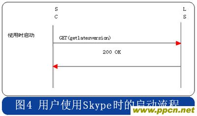 Skype的用戶終端啟動時,采用HTTP協(xié)議連接到注冊服務(wù)器,用戶初次安裝的啟動流程中攜帶“installed”的參數(shù),使用時啟動流程則在消息中攜帶“getlatestversion”參數(shù),具體流程分別見圖3和圖4。