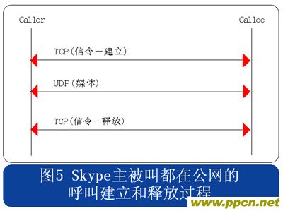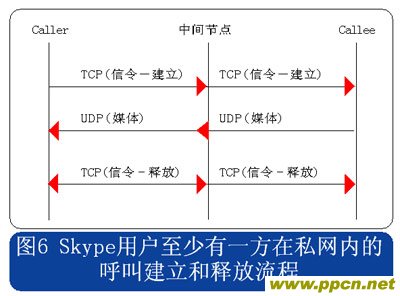 查找到希望連接的用戶后,可以將其加入好友列表,Skype用戶可以隨時與在線的好友進(jìn)行呼叫。經(jīng)過了稍微復(fù)雜的認(rèn)證過程和用戶查找過程,呼叫建立和釋放的過程就變得簡單了。用戶位于公網(wǎng)和位于私網(wǎng)內(nèi)部的情況會有所不同,兩種情況下的呼叫建立和釋放流程分別見圖5和圖6所示。
