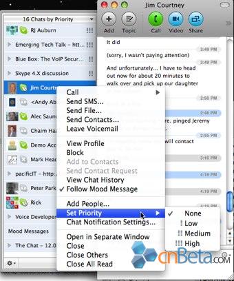 Skype 2.8 for Mac將于明天正式發(fā)布,它將帶來全新的功能,包括"屏幕共享"(screen sharing)和整合Wi-Fi熱點(diǎn)連接功能。此次新版本將首先向Mac OS X發(fā)布,不知道是不是為了迎接Macworld的到來。此次版本主要更新以下幾點(diǎn):