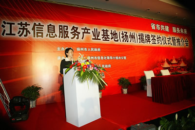 “腰纏十萬(wàn)貫,騎鶴下?lián)P州”——在“煙花三月”最美的季節(jié),在“長(zhǎng)江三角洲經(jīng)濟(jì)帶”最具活力的地區(qū),在榮獲“聯(lián)合國(guó)人居獎(jiǎng)”的揚(yáng)州,4月21、22日“江蘇信息服務(wù)產(chǎn)業(yè)基地(揚(yáng)州)揭牌簽約推介暨揚(yáng)州呼叫產(chǎn)業(yè)基地建設(shè)運(yùn)營(yíng)管理論壇”隆重舉行,揚(yáng)州市市長(zhǎng)、江蘇省信息產(chǎn)業(yè)廳廳長(zhǎng)、揚(yáng)州人大等四套班子以及來(lái)自北京、上海及江蘇省內(nèi)的各信息產(chǎn)業(yè)的相關(guān)企業(yè)高管及業(yè)內(nèi)知名專家,帶著投資,帶著知識(shí),帶著對(duì)信息揚(yáng)州規(guī)劃的建議,齊聚揚(yáng)州,共商大計(jì)。