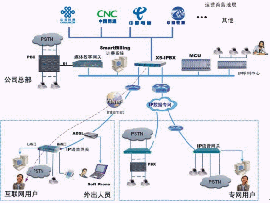 - 中心的X5-IPBX系統(tǒng)可以服務(wù)于互聯(lián)網(wǎng)用戶(hù)和企業(yè)內(nèi)部數(shù)據(jù)專(zhuān)網(wǎng)用戶(hù),實(shí)現(xiàn)雙網(wǎng)匯接,使得不同網(wǎng)絡(luò)中的用戶(hù)可以實(shí)現(xiàn)IP電話(huà)通信。