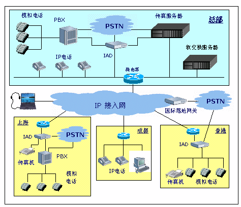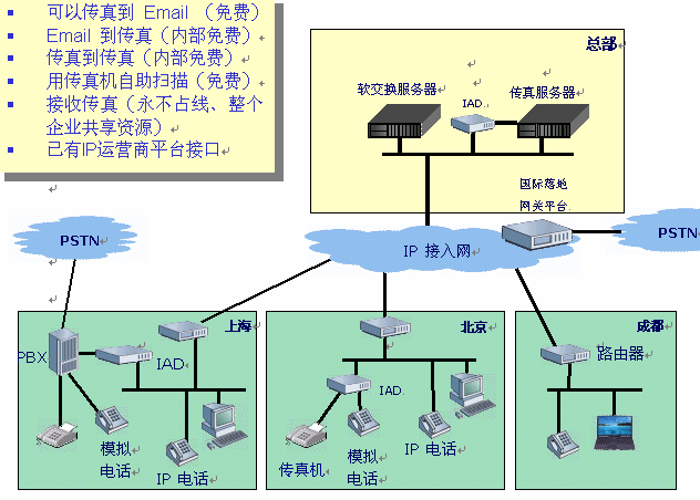 - 內(nèi)部IP電話(huà)、傳真網(wǎng)連接各地區(qū)PSTN市話(huà)網(wǎng),實(shí)現(xiàn)各地區(qū)間"長(zhǎng)途電話(huà)變市話(huà)"