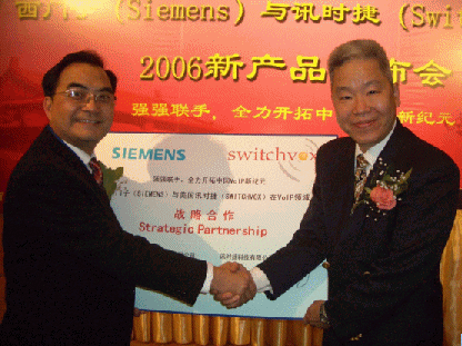 2006年3月29日的北京,還有些春風(fēng)料峭,但北京長(zhǎng)富宮的芙蓉廳卻是暖意融融,德國(guó)通訊業(yè)巨擘西門(mén)子(Siemens)和美國(guó)企業(yè)通訊業(yè)新寵訊時(shí)捷(Switchvox)聯(lián)合舉辦VoIP新產(chǎn)品發(fā)布會(huì),西門(mén)子終端通訊設(shè)備(上海)有限公司CEO