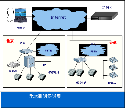 如圖所示,在整個(gè)系統(tǒng)中加入“訊時(shí)捷™ IPX”系統(tǒng)平臺設(shè)備后,各點(diǎn)之間話費(fèi)為零。