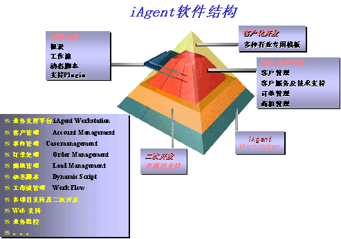 iAgent3.0從軟件內(nèi)部的結(jié)構(gòu)體系上加以突破,統(tǒng)一開放的應(yīng)用平臺(tái)上組合功能強(qiáng)大的二次開發(fā)工具,并在此基礎(chǔ)上加以針對(duì)行業(yè)而特別設(shè)計(jì)的功能模板。更好的適應(yīng)了企業(yè)處理流程的多樣化和需求的復(fù)雜化,并為企業(yè)高速的業(yè)務(wù)增長和功能需求增長帶來極大的拓展空間。軟件結(jié)構(gòu)如下圖所示: