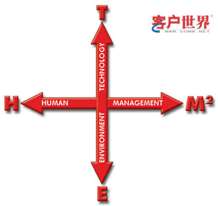 THEM2方法把呼叫中心看成是由技術(Technology)、人(Human)、環(huán)境(Environment)、管理(Management)組成的整體。這個方法的圖示是一個十字架(見圖一),M之上的2字的意思是說,所考慮的管理包括戰(zhàn)略管理(Strategic Management)和運營管理(Operational Management)兩個層面。