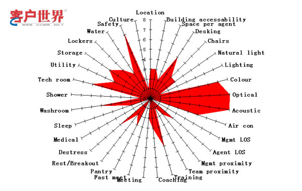 在“環(huán)境”類別之下,包括了與座席代表身心健康、工作便利性和管理有效性有關,體現(xiàn)呼叫中心物理特征的30多個子項。圖三顯示的就是某個假想呼叫中心的環(huán)境星狀圖。