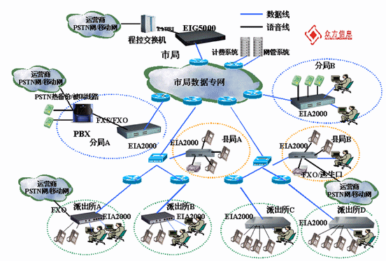 公安系統(tǒng)作為一家話務量較大的國家職能部門,平時各個分局,各個派出所之間及上下級之間的電話、傳真等交流非常多,每月支付的話費數(shù)目相當可觀,公安部門急需找到一種價格更便宜、服務更周到,同時使用便捷的通話解決方案,以降低辦公費用,提高工作效率。采用了深圳眾方信息的VoIP解決方案,能使得公安部門整體話費節(jié)省了至少50%以上,而且能實現(xiàn)多種業(yè)務的綜合處理,包括語音、數(shù)據、視頻、圖像等。