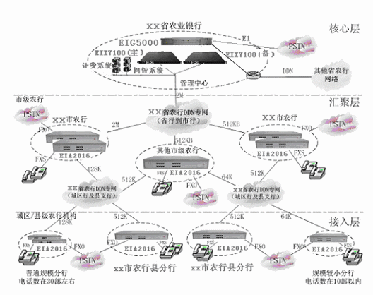 銀行原有數據網絡為省、市、縣三級結構,主干為64K-2M DDN或幀中繼,主要完成交易、結算、電子郵件等業(yè)務。由于原有專網帶寬有限,除了業(yè)務通信外,所剩帶寬不多,建議各市或縣分行數據專線升級至128K、512K或2M,網絡升級后帶寬足夠數據和語音并行使用。