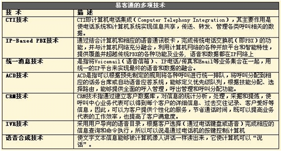 易客通將全套的語音、數(shù)據(jù)、互聯(lián)網(wǎng)服務(wù)和豐富的業(yè)務(wù)應(yīng)用整合到單個系統(tǒng)中(All-In-One),融合語音和數(shù)據(jù),以模塊化的形式提供各種功能(CRM、IVR、多媒體功能、錄音、報表、管理工具、客戶化產(chǎn)品定制開發(fā)工具、自動外撥系統(tǒng)等),滿足不同用戶的需求,系統(tǒng)開放、可靠、易于擴展和升級,容易獲得和使用,一切都非常簡單,可以從容應(yīng)對e時代企業(yè)通信系統(tǒng)所面臨的諸多復(fù)雜挑戰(zhàn)。