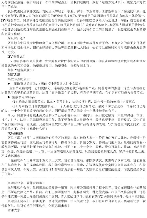 余輝先生在大會上表示,對于整個互聯(lián)網(wǎng)、軟件產(chǎn)業(yè)鏈條來說,在線軟件(SaaS)不但是最熱門的話題,更是順應(yīng)市場需要的新技術(shù)趨勢,中寬網(wǎng)信將和阿里軟件一起,在打造全球“軟件沃爾瑪超市”的過程中發(fā)揮自己的技術(shù)應(yīng)用研發(fā)強(qiáng)項(xiàng),為全國2億互聯(lián)網(wǎng)網(wǎng)民提供更豐富便利、更低成本的軟件服務(wù)。余輝先生還和與會嘉賓分享了中寬網(wǎng)信和阿里軟件合作過程中的體會和感悟。