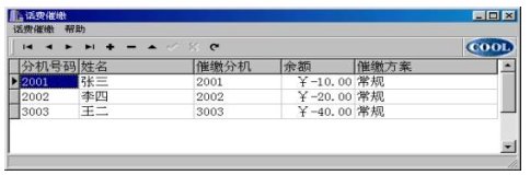 催繳調度表中的%欠費%,用戶可以從計費系統的月報表中提出(用戶輸入月份,自動根據催繳電話取過來);也可由用戶再次修改(針對所欠不是一個月的費用),但“刷新”又從從計費系統的月報表中更新數據。