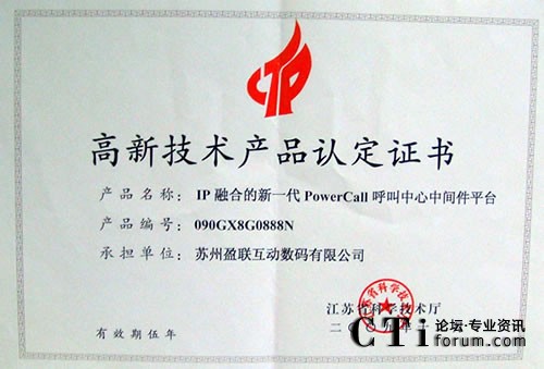 CTI論壇(ctiforum)4月20日消息(記者 楊毅):近日,蘇州盈聯(lián)互動數(shù)碼有限公司榮獲江蘇省科學(xué)技術(shù)廳頒發(fā)的高新技術(shù)產(chǎn)品認定證書,這標志著盈聯(lián)作為一家專業(yè)的呼叫中心解決方案提供商,其產(chǎn)品的先進性和高品質(zhì)已獲得了中國技術(shù)部門的官方認可。