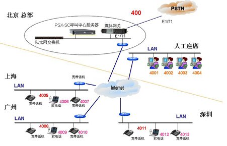 PSX-CC呼叫中心系統(tǒng)服務(wù)器放在北京總部機房,上海,深圳,廣州三地均通過互聯(lián)網(wǎng)將遠端座席注冊到總部系統(tǒng),為了節(jié)省硬件投資,所有座席采用軟件電話。座席電話有錄音功能,并且可隨時查看通話清單。系統(tǒng)可配合目前的400,800電話,將所有呼入電話轉(zhuǎn)入遠端坐席,讓呼叫中心沒有地域的限制。