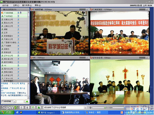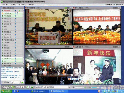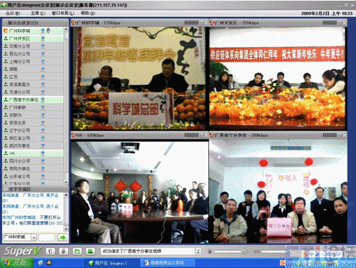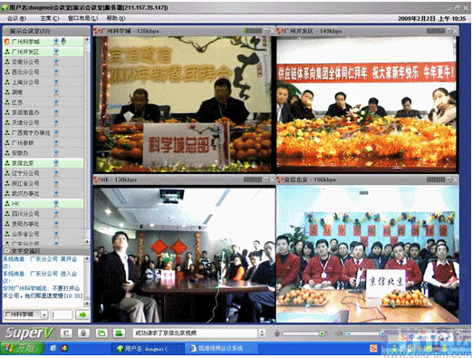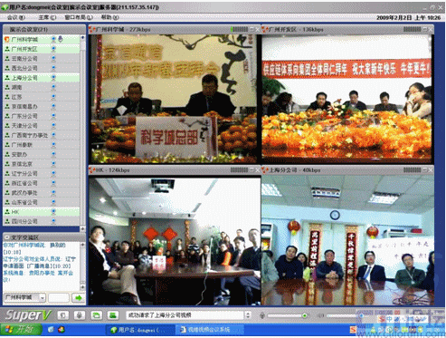 春節(jié)是中華民族的傳統(tǒng)的節(jié)日,尤其是跨國(guó)企業(yè)集團(tuán),身在海外的游子們,這一刻多么期待與在國(guó)內(nèi)的親人、朋友、以及同事網(wǎng)絡(luò)“面對(duì)面”的過(guò)春節(jié);因此,一些企業(yè)用視維視頻會(huì)議舉辦了別開(kāi)生面的視頻拜年會(huì)。其中京信通信公司視頻年會(huì)尤為精彩,廣州科學(xué)城的主會(huì)場(chǎng)、廣州開(kāi)發(fā)區(qū)、香港、北京、上海、西北分公司、武漢等20多個(gè)分公司通過(guò)視維視頻會(huì)議互拜大年,通過(guò)網(wǎng)絡(luò)視頻,遠(yuǎn)隔千里一樣可以“面對(duì)面”的送上新春祝福。如下圖:
