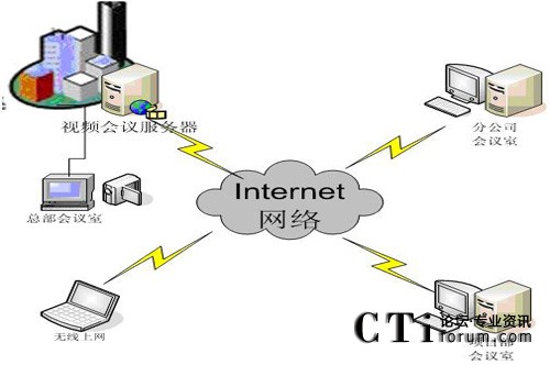 視維根據(jù)互聯(lián)網(wǎng)的網(wǎng)絡(luò)現(xiàn)狀和IT硬件資源制定了一套可行的平民化的低帶寬下的高清視頻會議解決方案。以企業(yè)總部為主會場,其他地區(qū)的分公司、各營銷網(wǎng)點和各移動多媒體終端作為分會場,其網(wǎng)絡(luò)拓?fù)鋱D如下: