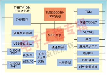 TI提供全面的VoIP解決方案,覆蓋IP電話、家庭網(wǎng)關(guān)、電信級網(wǎng)關(guān)以及VoADSL和VoCable。針對企業(yè)級IP電話需求,TI提供了多種解決方案,其中TNETV1050/TNEV1055的SoC方案基于TI的TMS320C55x DSP系列的可編程DSP和增強的32位MIPS內(nèi)核。它使用先進的系統(tǒng)架構(gòu),在提供高性能低功耗的同時,兼顧系統(tǒng)的可擴展性,還包括豐富的外設(shè)接口,滿足設(shè)計企業(yè)級電話系統(tǒng)的要求。