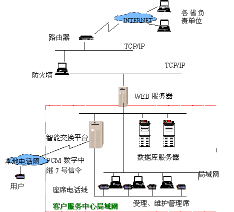 數(shù)據(jù)通信局的客戶(hù)遍布全國(guó)各地,建立一個(gè)覆蓋全國(guó)的客戶(hù)服務(wù)網(wǎng)絡(luò)勢(shì)在必行,因此我公司為之構(gòu)建了數(shù)據(jù)通信局客戶(hù)服務(wù)系統(tǒng),全國(guó)各地的各個(gè)客服中心的數(shù)據(jù)可以通過(guò)專(zhuān)線連接,語(yǔ)音也可以通過(guò)VOIP用數(shù)字專(zhuān)線連接,以降低長(zhǎng)話費(fèi)用。該系統(tǒng)的投入使用,不但滿(mǎn)足了數(shù)據(jù)局為全國(guó)各地客戶(hù)服務(wù)的需要,而且可以收集客戶(hù)信息,不但降低了辦公費(fèi)用,而且有利于擴(kuò)大市場(chǎng)分額。數(shù)據(jù)通信客戶(hù)服務(wù)中心的主要目的是解決對(duì)全國(guó)大客戶(hù)的業(yè)務(wù)咨詢(xún)與申辦、障礙申告、投訴與建議的集中管理以及處理控制,系統(tǒng)采用800號(hào)接入,以一個(gè)小型的交換設(shè)備為座席電話分配點(diǎn),客戶(hù)撥入的電話,經(jīng)小型交換設(shè)備分配到空閑的座席上。