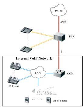 酒店申請了4條到CNC的E1線路,用于語音呼叫業(yè)務,同時內部還建設有覆蓋整個酒店的VoIP網絡,通過CCM系統(tǒng)進行集中管理,CCM系統(tǒng)與PBX之間通過E1線進行連接。