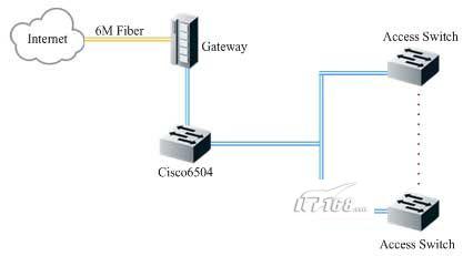 客房局域網通過一條6M的光纖接入CNC網絡,網關設備承擔了DHCP、NAT和流量限制等功能,同時在思科6504上安裝有安全板卡,對內部網絡安全進行加強和防御。由于每個客房有2~3個信息點,客房局域網總共有1300個左右的信息點。