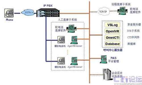 本方案采用IP-PBX 硬件平臺配合CTI系統(tǒng)軟件來建設呼叫服務系統(tǒng)。IP-PBX作為坐席接入的硬件接口平臺,采用上海傲威科技有限公司自主研發(fā)的IP-PBX產(chǎn)品AVX2000pro來實現(xiàn),AVX2000pro提供標準RJ11固件接口,為坐席員提供語音接入,坐席員耳麥話機直接與RJ11接口互連。坐席電腦通過局域網(wǎng)口與CTI軟件服務系統(tǒng)互連。