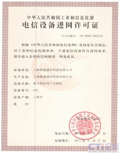 近日,國內(nèi)知名的VOIP全系列產(chǎn)品和解決方案提供商---傲威通信科技有限公司,自主研發(fā)的AVX系列語音電話交換機順利通過工業(yè)與信息化部審核,取得“電信設(shè)備進網(wǎng)許可證”。此舉標志著傲威通信的AVX系列產(chǎn)品已成功取得接入國家電信網(wǎng)的資質(zhì),為大規(guī)模的推廣應(yīng)用打下了堅實基礎(chǔ)。