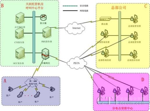方案二:400電話+托管呼叫中心平臺+坐席統(tǒng)一部署在總部