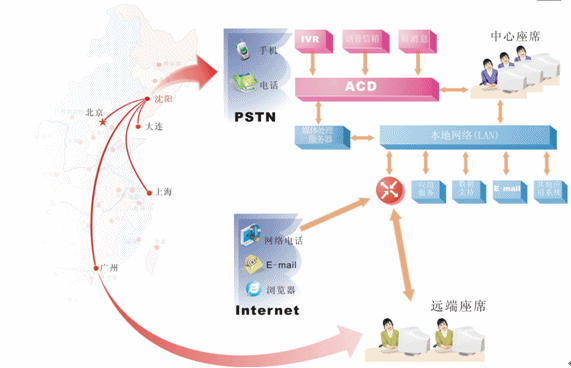 對于地區(qū)分布廣泛,而又要集中管理的企業(yè),可在各個局部地區(qū)設(shè)置遠端座席,并通過網(wǎng)絡(luò)方便的接入中心系統(tǒng)。我們?yōu)檫h端座席提供與中心座席完全相同的操作,遠端座席可以根據(jù)各個地區(qū)的特定情況有針對性的處理各個局部地區(qū)的業(yè)務,為中心分流壓力,同時中心系統(tǒng)也可以完全掌握遠端座席的情況。我們可以非常明確的一點是:采用分布式座席的技術(shù),使得遠端座席與中心座席除了地域上的差異,其它部分完全相同?梢哉f只要網(wǎng)絡(luò)無極限,座席分布就是無極限的。