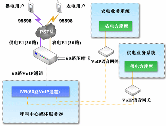 由于要保證供、農(nóng)電統(tǒng)一95598號碼的接入,呼叫中心系統(tǒng)采用供、農(nóng)電合一的方式,建立統(tǒng)一的呼叫中心系統(tǒng),并保證系統(tǒng)接入容量及其他資源能夠滿足統(tǒng)一的要求;在自動(dòng)語音菜單中,分別設(shè)立供、農(nóng)電用戶層,用戶可以自行區(qū)分、選擇進(jìn)入相應(yīng)的導(dǎo)航菜單中,確認(rèn)之后,系統(tǒng)默認(rèn)記錄該用戶的類型,再次呼叫時(shí),系統(tǒng)自動(dòng)識別該用戶供、農(nóng)電類型;在確認(rèn)了用戶類型之后,用戶選擇轉(zhuǎn)接人工座席時(shí),自動(dòng)進(jìn)入相應(yīng)的供電座席組或者農(nóng)電座席組,并且,在確定轉(zhuǎn)接錯(cuò)誤分組之后,可以由座席進(jìn)行再次轉(zhuǎn)接。