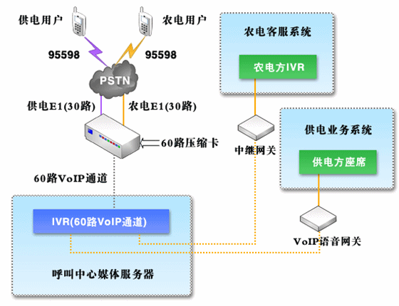 對于呼叫中心系統(tǒng),由95598特別號碼統(tǒng)一接入,并且在供電呼叫中心系統(tǒng)與農(nóng)電呼叫中心系統(tǒng)之間采用中繼方式(模擬中繼或者數(shù)字中繼,視農(nóng)電方實(shí)際情況而定)進(jìn)行話路連接,同時(shí)保證系統(tǒng)接入容量及其他資源能夠滿足統(tǒng)一的要求;在自動(dòng)語音菜單中,分別設(shè)立供、農(nóng)電用戶層,用戶可以自行區(qū)分、選擇,對于農(nóng)電用戶在確定用戶類型之后,通過中繼將話路轉(zhuǎn)接到農(nóng)電方呼叫中心系統(tǒng)。
