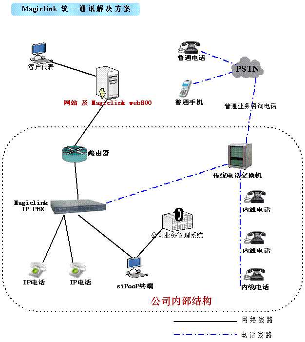Magiclink統(tǒng)一通訊解決方案利用我公司的全線產(chǎn)品,將企業(yè)的:網(wǎng)站、內(nèi)部電話、呼叫中心、客戶管理系統(tǒng)完整的整合在一起。通過(guò)這種整合起到了:降低成本、增加營(yíng)銷手段、提升資源利用率的特點(diǎn)。