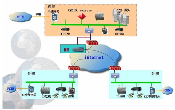 由于電信運營商的線路租賃費用非常昂貴,對于中小企業(yè)來說是一項不小的負擔,所以中小企業(yè)的組網(wǎng)方式一般采用ADSL方式,來降低費用,而ADSL的組網(wǎng)方式往往都經(jīng)過了幾層地址轉(zhuǎn)換了,這樣在分部或分支機構(gòu)的IP電話終端就無法穿透防火墻,實現(xiàn)和外面成功通話,所以需要在總部配置1臺媒體路由器(MR)來做語音代理,完成呼叫連接的建立。