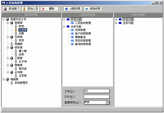 在這一模塊,管理員可以自由設(shè)置人員結(jié)構(gòu)、系統(tǒng)權(quán)限、客戶權(quán)限、查詢權(quán)限等;可以根據(jù)業(yè)務(wù)的需求在數(shù)據(jù)字典里自行添加報(bào)表或字段,并且設(shè)定業(yè)務(wù)表之間的關(guān)聯(lián)性;還可進(jìn)行工作流的設(shè)定與分配,等等。
