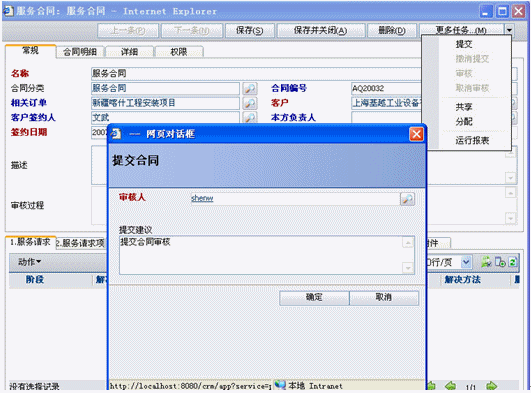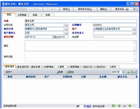 服務(wù)合同是也分為兩種,一種是非公司項(xiàng)目的服務(wù)請求此時沒有與訂單關(guān)聯(lián);二種是公司項(xiàng)目后服務(wù)請求,此時可以關(guān)聯(lián)訂單也可以不關(guān)聯(lián)訂單,如果關(guān)聯(lián)訂單就可以將訂單產(chǎn)品明細(xì)導(dǎo)入合同明細(xì)中(導(dǎo)入明細(xì)是可以調(diào)整數(shù)量和價格的).