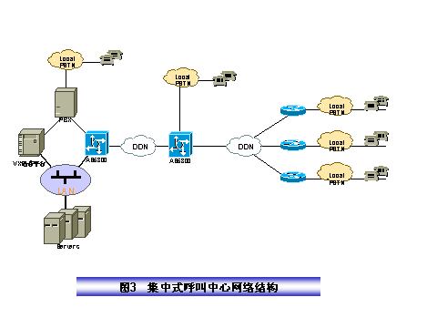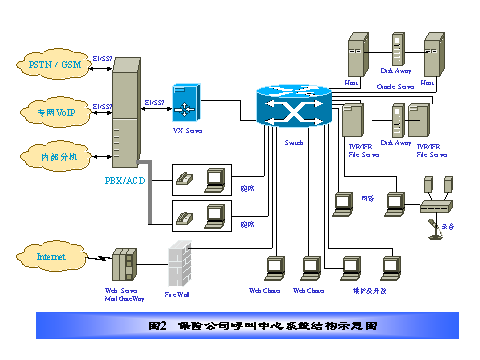 某保險公司電話中心采取全國集中服務(wù)方式,其結(jié)構(gòu)如圖2所示,在電話呼叫中心集中管理所有人工語音坐席和電話中心運(yùn)行所需的所有業(yè)務(wù)數(shù)據(jù)、語音文件和硬件設(shè)備,服務(wù)全國。我們設(shè)計的方案具有如下特點(diǎn):